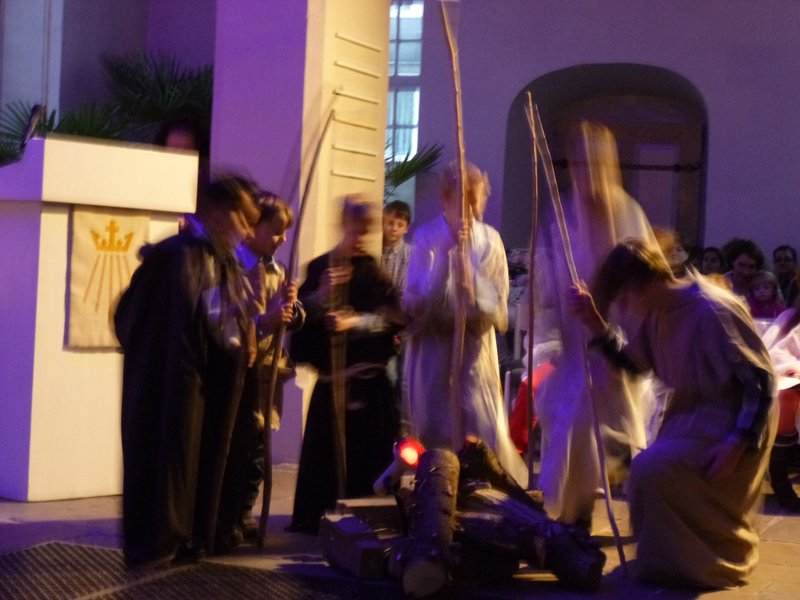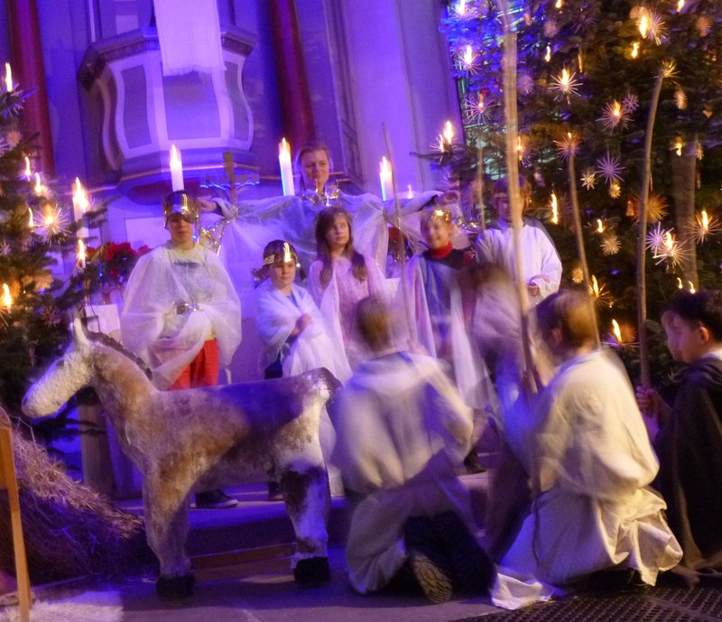 Erstmals konnten bei einer Kinder-Christvesper Kinder ab 6 Jahre bei dem Krippenspiel am Nachmittag spontan mitspielen. Maria und Josef waren dabei sein, der Wirt, Engel und Hirten.