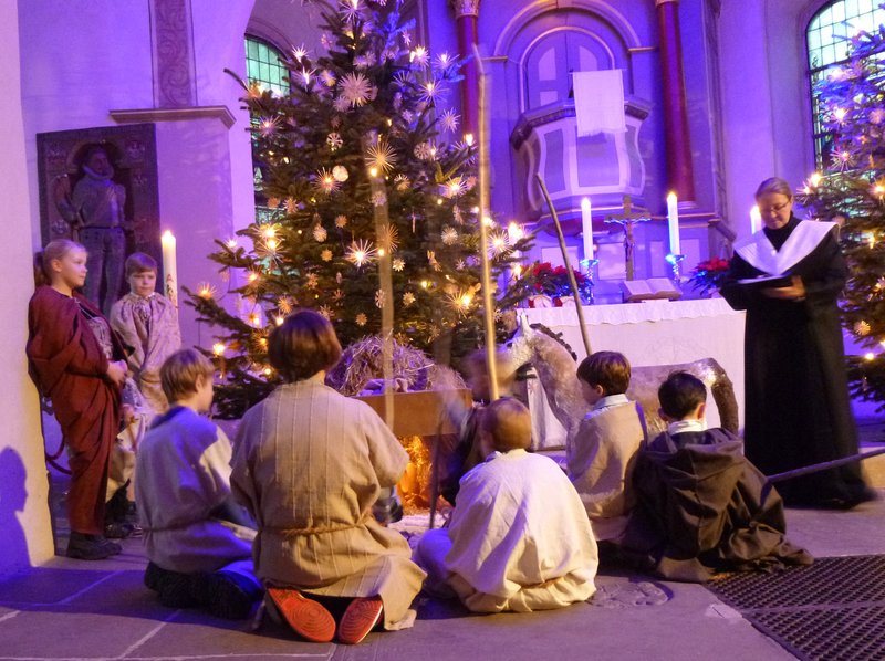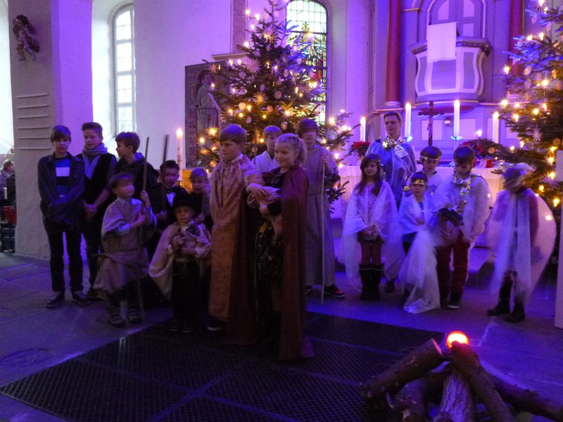Die Weihnachtsgeschichte wurde kindgerecht erzählt und die Kinder spielten mit. Die Weihnachtsgeschichte aus dem Lukas-Evangelium zum Nachlesen: Jesu Geburt "Es begab sich aber zu der Zeit, dass ein Gebot von dem Kaiser Augustus ausging, dass alle Welt geschätzt würde. Und diese Schätzung war die allererste und geschah zur Zeit, da Quirinius Statthalter in Syrien war. Und jedermann ging, dass er sich schätzen ließe, ein jeder in seine Stadt. Da machte sich auf auch Josef aus Galiläa, aus der Stadt Nazareth, in das jüdische Land zur Stadt Davids, die da heißt Bethlehem, weil er aus dem Hause und Geschlechte Davids war, damit er sich schätzen ließe mit Maria, seinem vertrauten Weibe; die war schwanger. Und als sie dort waren, kam die Zeit, dass sie gebären sollte. Und sie gebar ihren ersten Sohn und wickelte ihn in Windeln und legte ihn in eine Krippe; denn sie hatten sonst keinen Raum in der Herberge. Und es waren Hirten in derselben Gegend auf dem Felde bei den Hürden, die hüteten des Nachts ihre Herde. Und der Engel des Herrn trat zu ihnen, und die Klarheit des Herrn leuchtete um sie; und sie fürchteten sich sehr. Und der Engel sprach zu ihnen: Fürchtet euch nicht! Siehe, ich verkündige euch große Freude, die allem Volk widerfahren wird; denn euch ist heute der Heiland geboren, welcher ist Christus, der Herr, in der Stadt Davids. Und das habt zum Zeichen: Ihr werdet finden das Kind in Windeln gewickelt und in einer Krippe liegen. Und alsbald war da bei dem Engel die Menge der himmlischen Heerscharen, die lobten Gott und sprachen: Ehre sei Gott in der Höhe und Friede auf Erden bei den Menschen seines Wohlgefallens. Und als die Engel von ihnen gen Himmel fuhren, sprachen die Hirten untereinander: Lasst uns nun gehen nach Bethlehem und die Geschichte sehen, die da geschehen ist, die uns der Herr kundgetan hat. Und sie kamen eilend und fanden beide, Maria und Josef, dazu das Kind in der Krippe liegen. Als sie es aber gesehen hatten, breiteten sie das Wort aus, das zu ihnen von diesem Kinde gesagt war. Und alle, vor die es kam, wunderten sich über das, was ihnen die Hirten gesagt hatten. Maria aber behielt alle diese Worte und bewegte sie in ihrem Herzen. Und die Hirten kehrten wieder um, priesen und lobten Gott für alles, was sie gehört und gesehen hatten, wie denn zu ihnen gesagt war."