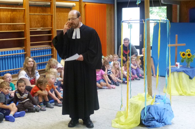 Das Abschlussfest eröffnete Pfarrer Jörg Schubert mit einem Gottesdienst, in dem sich Kinder und Eltern noch einmal an die Streiche von Michel aus Lönneberga erinnern konnten.