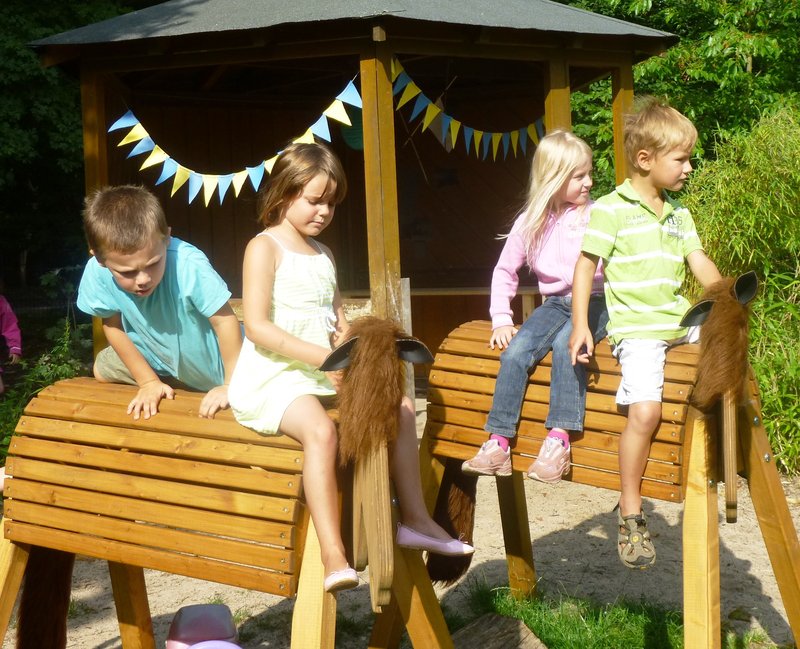 Um eine Spiel- und Bastelattraktivität reicher ist seit diesem Sommer nach der Ferienbetreung das Außengelände der Kita. Ein neues Schwedenhaus ist entstanden, dass demnächst als "Werkstube" genutzt wird. Zunächst aber stehen die "Pippi Langstrumpf"-Pferde in der Aufmerksamkeit der Kinder ganz oben.