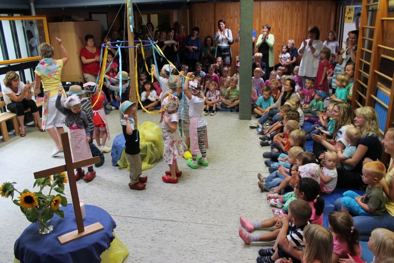 Einige Kinder tanzen in Holzschuhen einen schwedischen Tanz und auch den Kita-Schlager "Mein Gott - so groß und so mächtig" schmetterten die Kinder voll Freude. Auf dem blauen-gelben schwedischen Büffett fehlte schließlich auch das Knächebrot nicht.