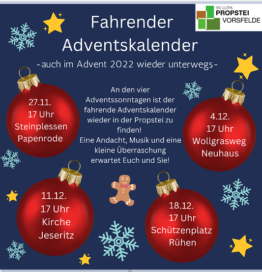 Der Jeseritzer Kirchenvorstand lädt recht herzlich zu einer vorweihnachtlichen Veranstaltung ein. Der Fahrende Adventskalender der Propstei Vorsfelde wird am 11.12.2022 um 17 Uhr vor der Jeseritzer Kirche sein, nach einer kurzen Andacht und einem kleinen Geschenk für jeden, lädt der Kirchenvorstand zum Adventslieder singen ein. Mit Glühwein, Tee und Bratwurst soll der musikalische Abend ausklingen, die Kirchenvorstände freuen sich auf viele Besucher.