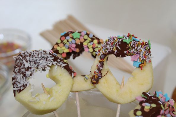 Schält und schneidet die Äpfel in Scheiben und entkernt sie mit den Ausstechförmchen. Aufgespießt auf einen Holzspieß in die geschmolzene Schokolade tauchen und anschließend in den Streuseln wälzen. Hmmm lecker