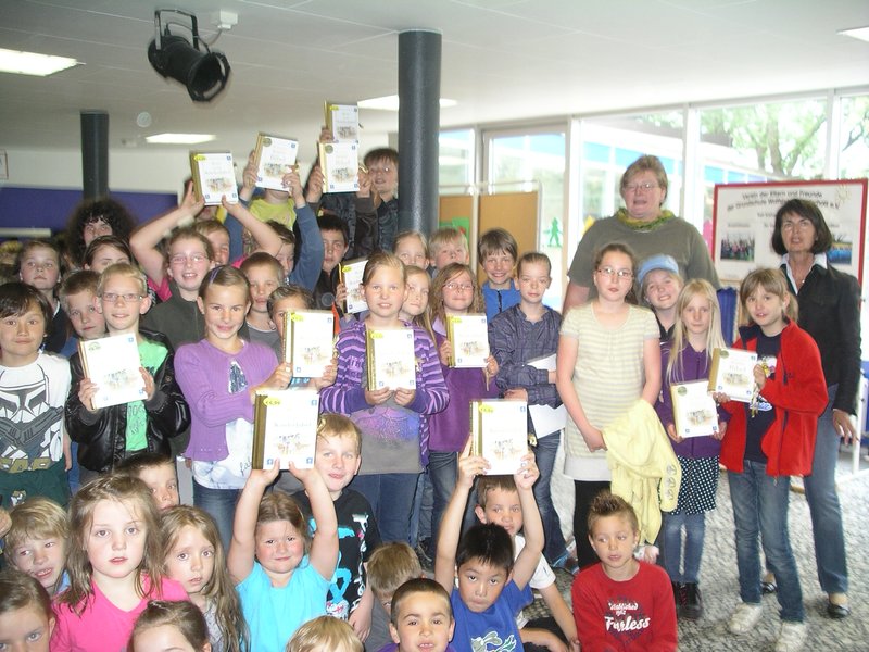 Schulleiterin Renate Gerckens bedankt sich im Namen der Kinder für die Spende. Einige Kinder erkennen sofort die Kinderbibeln wieder, die sie schon in der St. Petrus-Butze der Kindertagesstätte kennen gelernt haben und freuen sich jetzt darauf, dass sie die Texte zu den Geschichten schon selbst lesen können.