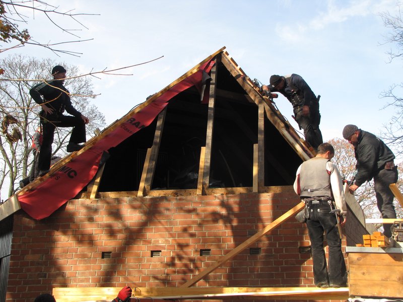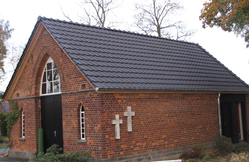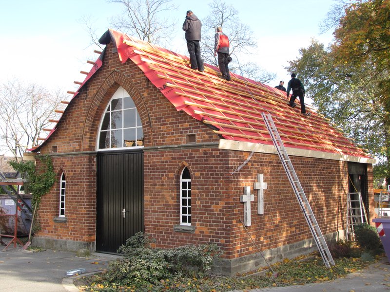 Das Dach der mehr als 100 Jahre alten Kapelle auf dem ebenfalls über 100 Jahre alten Friedhof wurde abgedeckt, alte Ziegel und Schiefer wurden entsorgt und es konnte mit neuen Tonziegeln eingedeckt werden. Nach 1 1/2 Tagen erstrahlte das Dach in neuem Glanz.